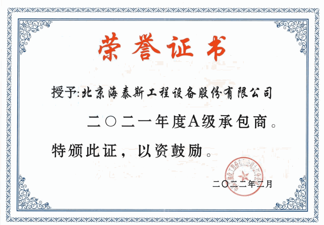 海泰斯為優質客戶提供的法蘭連接密封完整性管理方案及工程技術服務, 被授予“二0二一年度A級承包商”榮譽稱號。